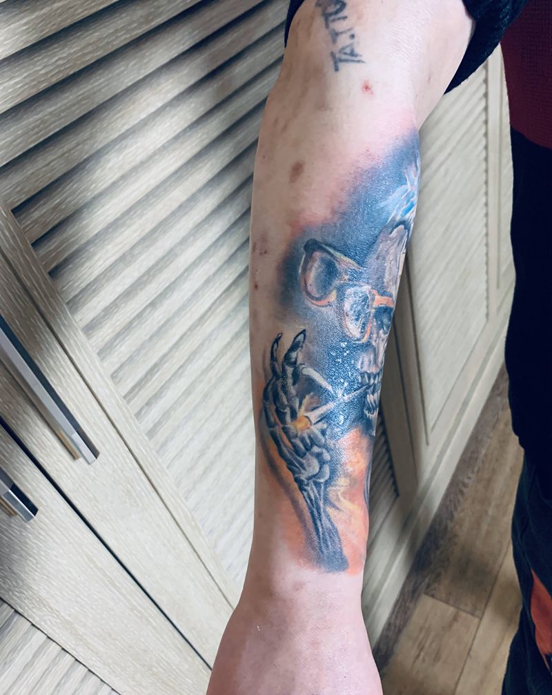当前位置: 首页 >山东省青岛市纹身店-西海岸美术刺青纹身图案>骷髅音乐家纹身图片_手臂欧美写实暗黑纹身图案