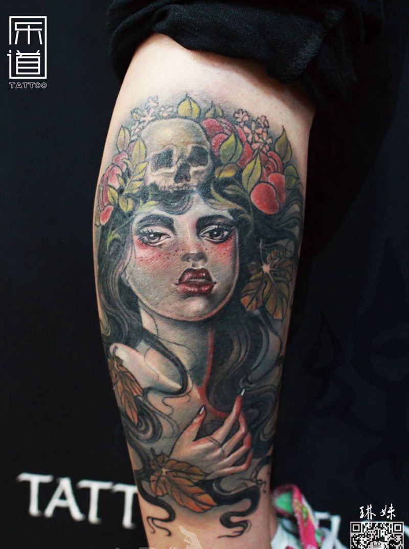 newschool女孩纹身图片_School 卡通人物肖像写实清新腿部成品纹身图案