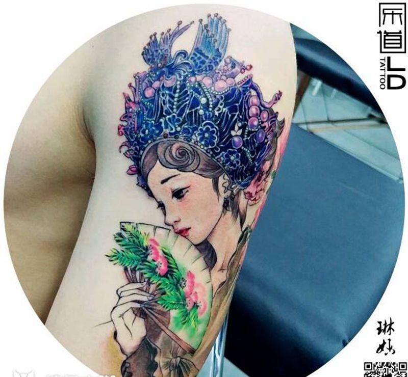 当前位置: 首页 >山东省青岛市纹身店-西海岸美术刺青纹身图案>花旦纹身图片_手臂欧美传统肖像清新写实人物成品纹身图案