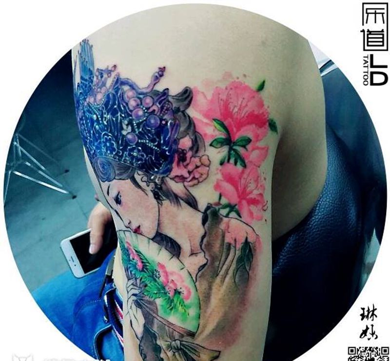 当前位置: 首页 >山东省青岛市纹身店-西海岸美术刺青纹身图案>花旦纹身图片_手臂欧美传统肖像清新写实人物成品纹身图案