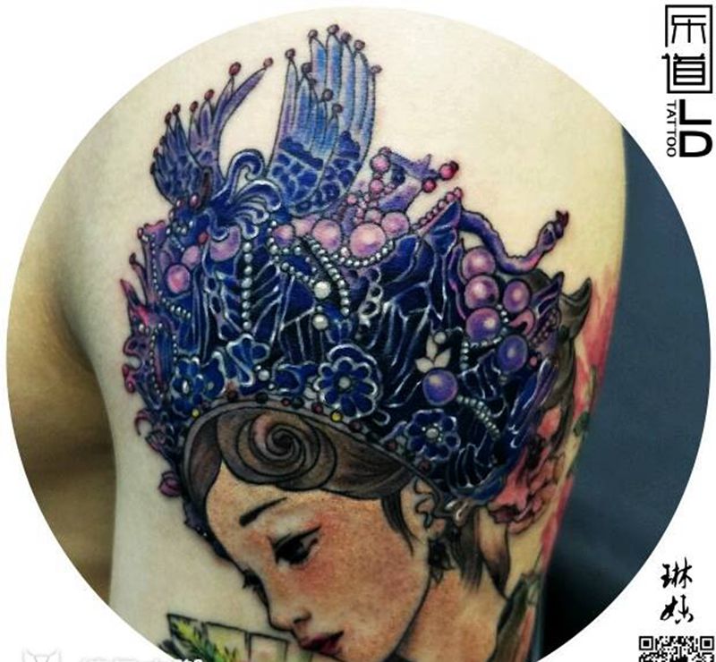 当前位置: 首页 >山东省青岛市纹身店-西海岸美术刺青纹身图案>花旦纹身图片_手臂欧美传统肖像清新写实人物成品纹身图案