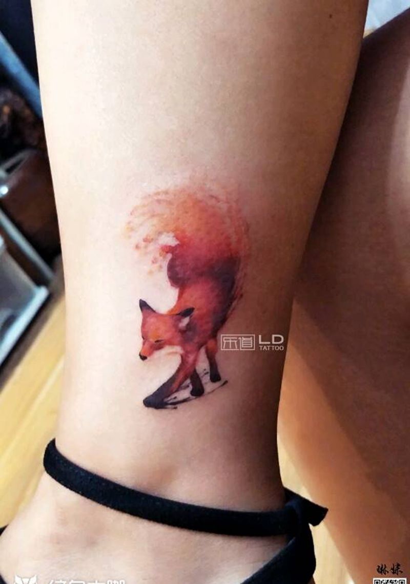 水彩小狐狸纹身图片_腿部清新国画动物原创成品纹身图案