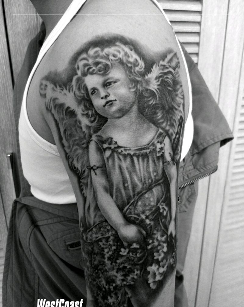 小天使纹身图片_手臂欧美肖像写实人物原创招生培训学习成品手稿纹身图案