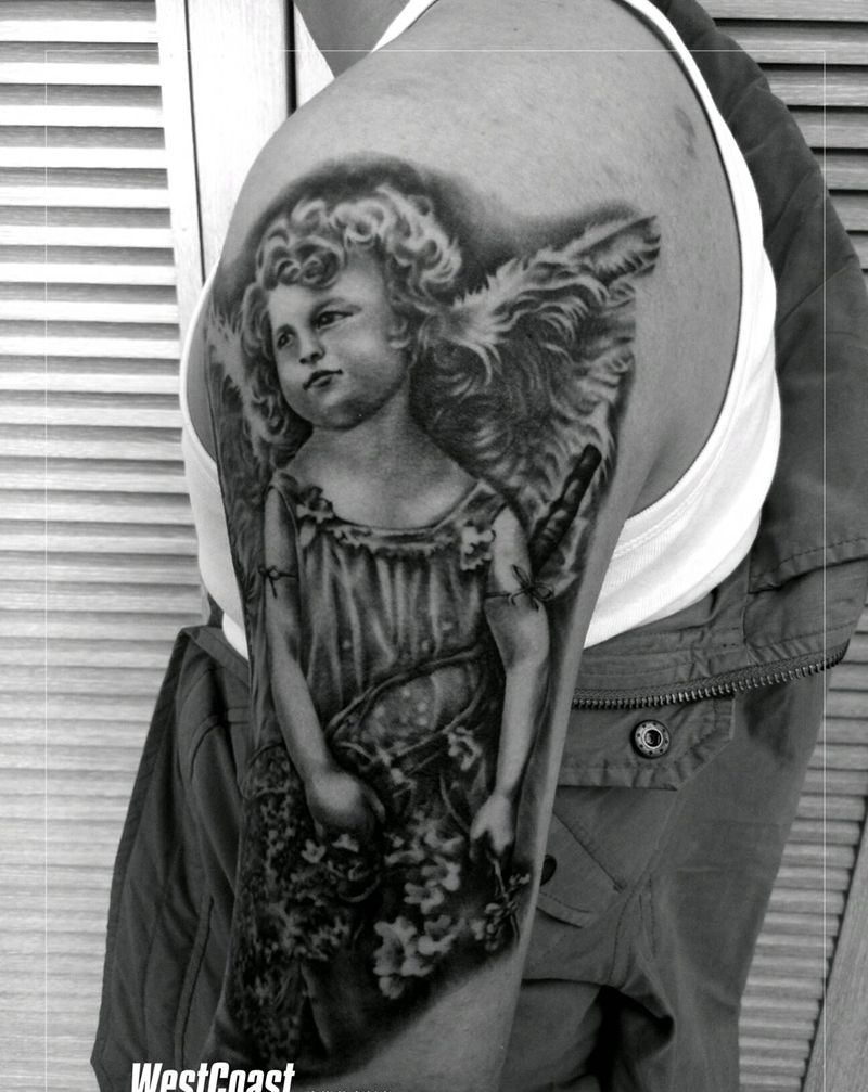 小天使纹身图片_手臂欧美肖像写实人物原创招生培训学习成品手稿纹身图案