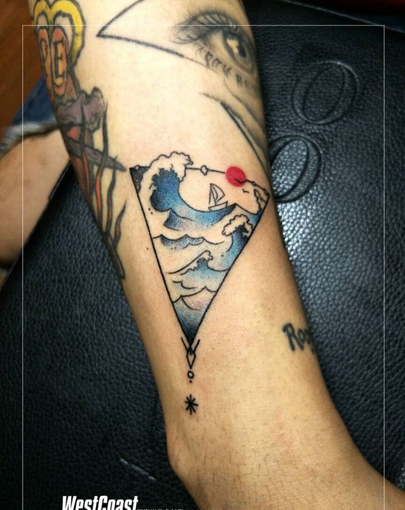 彩色小图合集纹身图片_手臂肩部点刺水彩水浪,沙漏纹身图案