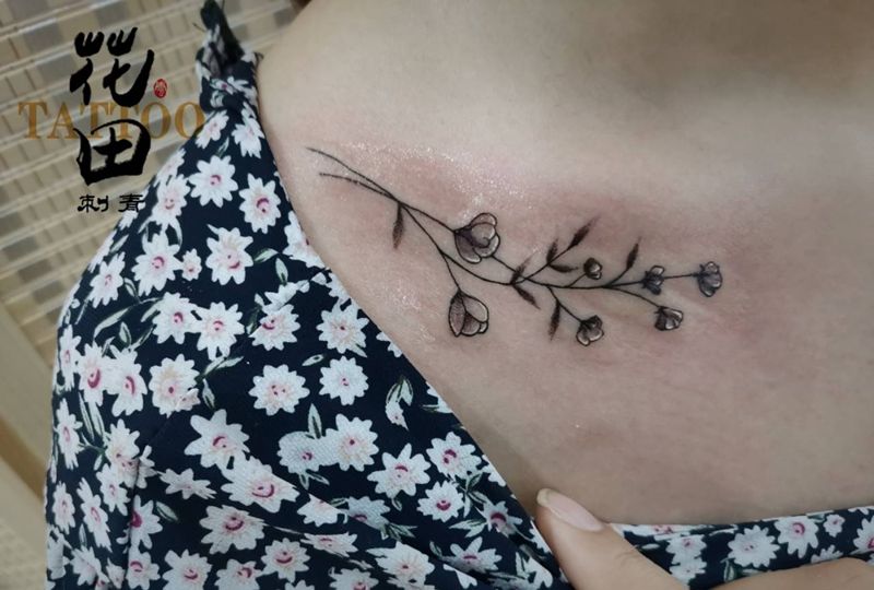 当前位置: 首页 >山东省青岛市纹身店-花田刺青纹身图案>锁骨小素花纹身图片_肩部颈部几何点刺素花肩花纹身图案