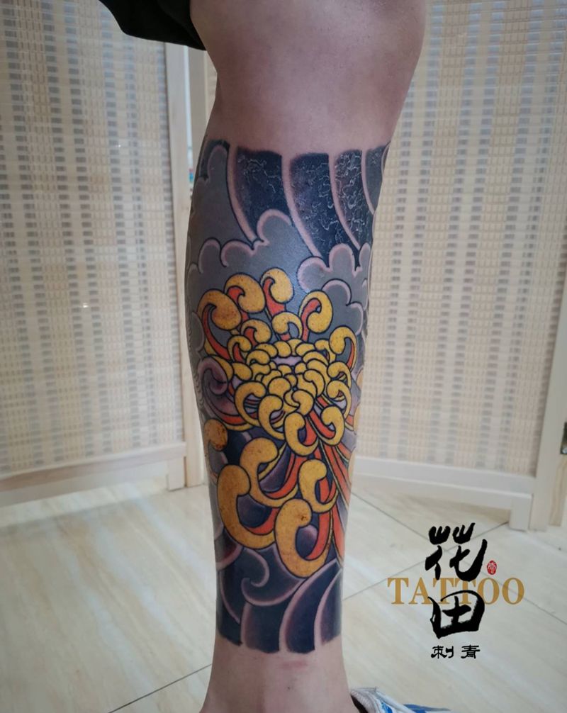 当前位置: 首页 >山东省青岛市纹身店-花田刺青纹身图案>老传统花腿纹身图片_腿部脚部老传统新传统天狗菊花纹身图案