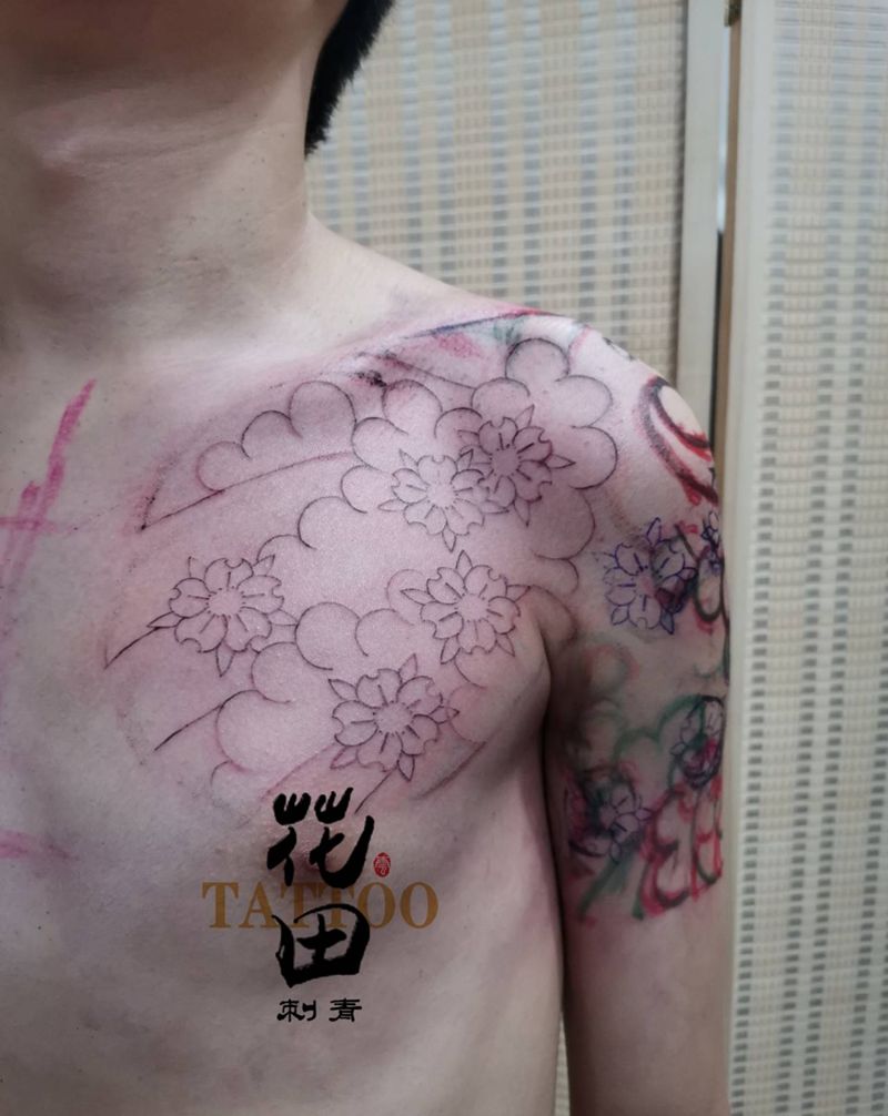 当前位置: 首页 >山东省青岛市纹身店-花田刺青纹身图案>传统半甲设计纹身图片_肩部手臂老传统樱花板雾泡泡云纹身图案