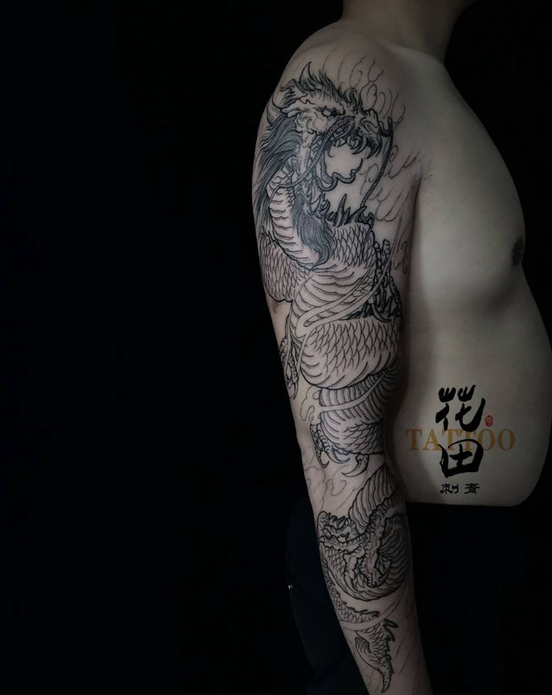 当前位置: 首页 >山东省青岛市纹身店-花田刺青纹身图案>花臂龙线条纹身图片_手臂肩部新传统老传统龙花臂线条纹身图案