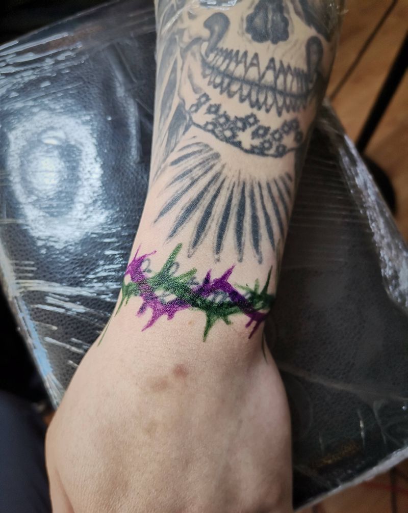 当前位置: 首页 >山东省青岛市纹身店-花田刺青纹身图案>手环荆棘遮盖纹身图片_手臂Old School臂环遮盖荆棘纹身图案