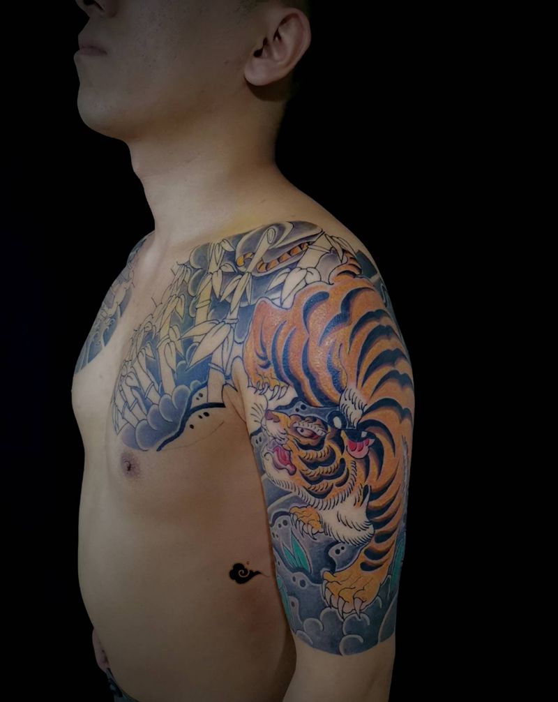 当前位置: 首页 >山东省青岛市纹身店-花田刺青纹身图案>老传统半甲虎纹身图片_手臂胸部老传统虎日式老传统纹身图案