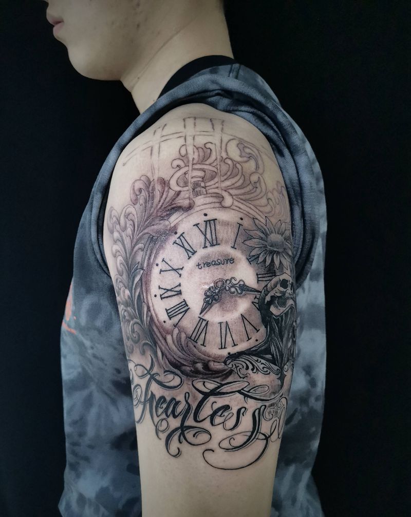 当前位置: 首页 >山东省青岛市纹身店-花田刺青纹身图案>写实钟表骷髅花体字纹身图片_手臂肩部欧美写实新传统钟表花体字骷髅纹身图案