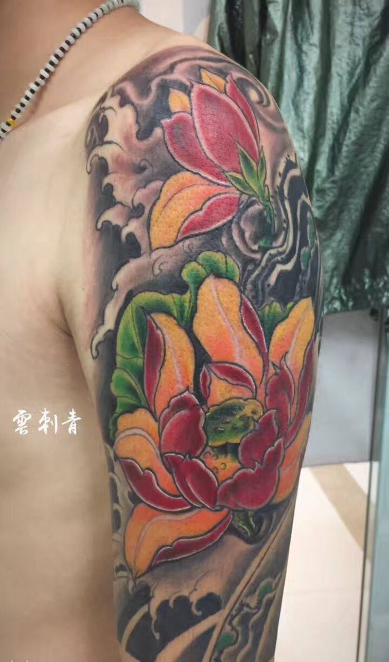 当前位置: 首页 >山东省青岛市纹身店-花田刺青纹身图案>大臂传统莲花纹身图片