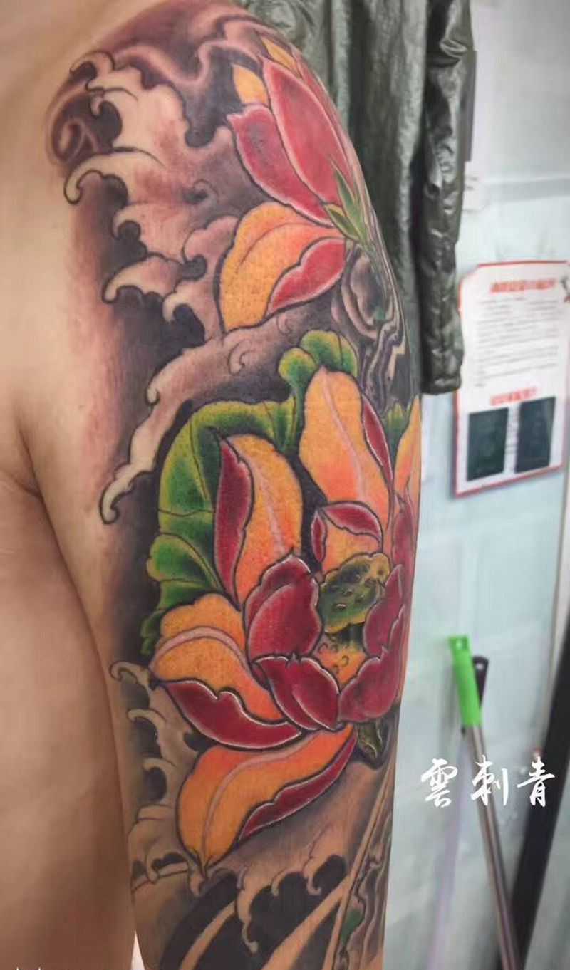 当前位置: 首页 >山东省青岛市纹身店-花田刺青纹身图案>大臂传统莲花纹身图片