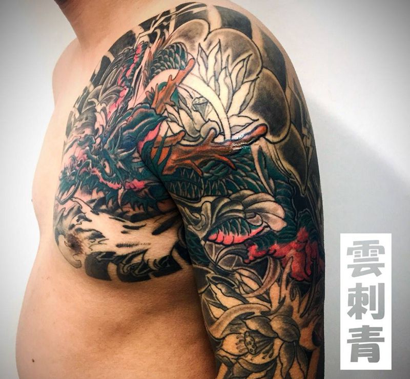 当前位置: 首页 >山东省青岛市纹身店-花田刺青纹身图案>半胛龙纹身图片_胸部手臂传统雲刺青纹身图案