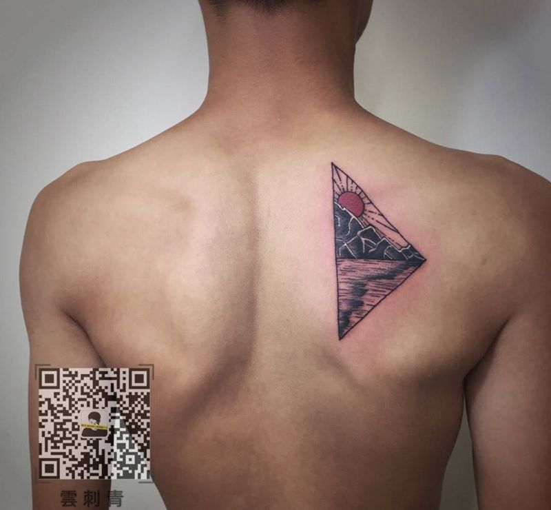 后背小图纹身图片_背部肩部几何点刺风景纹身图案