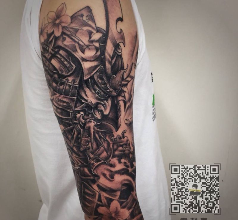 当前位置: 首页 >山东省青岛市纹身店-花田刺青纹身图案>花臂纹身图片_手臂肩部欧美写实新传统鬼武士般若钟表纹身图案