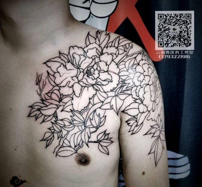 线条纹身图片_胸部肩部新传统水墨纹身图案