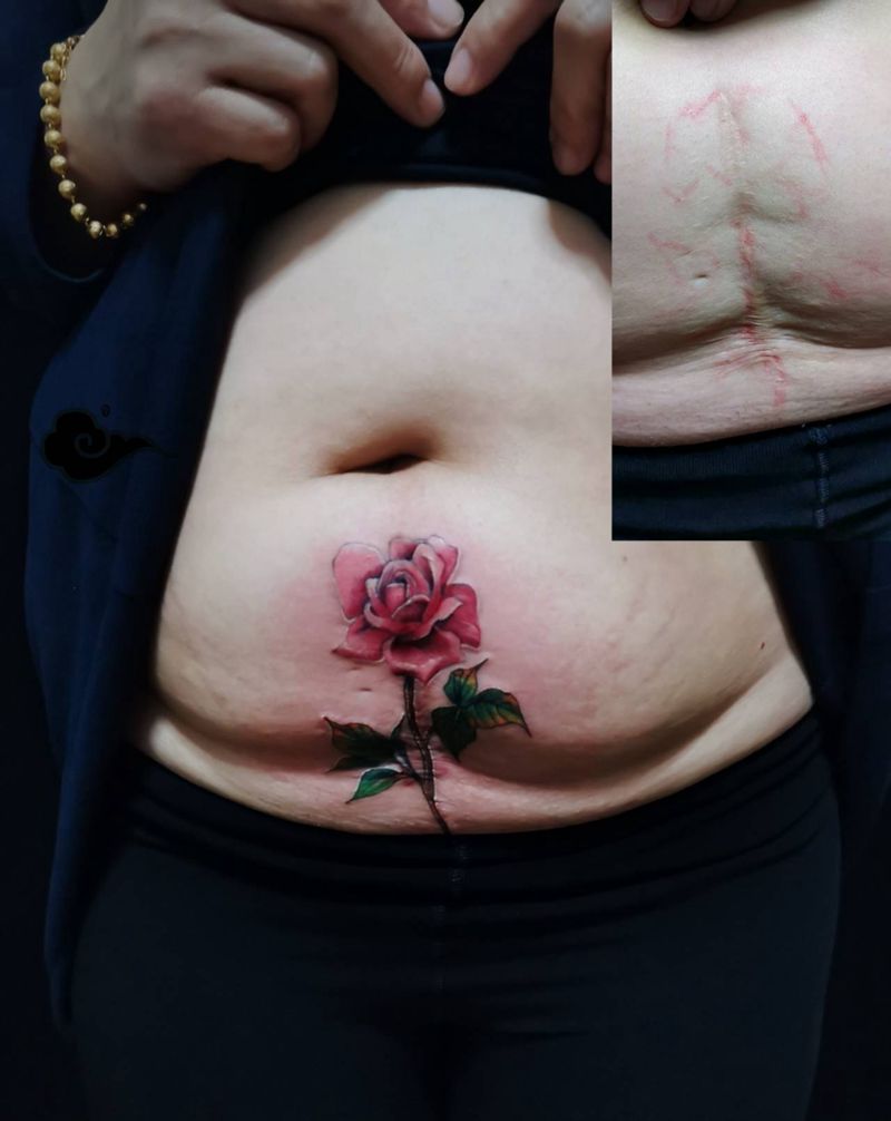 遮盖剖腹产疤痕纹身图片_腹部Old School剖腹产纹身图案