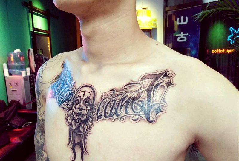 小丑和花体字纹身图片_胸部花体字纹身图案