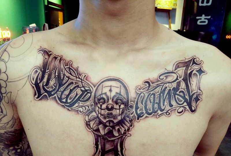 小丑和花体字纹身图片_胸部花体字纹身图案