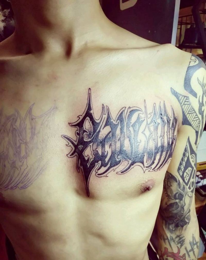 胸部奇卡诺字遮盖纹身图片_胸部花体字纹身图案