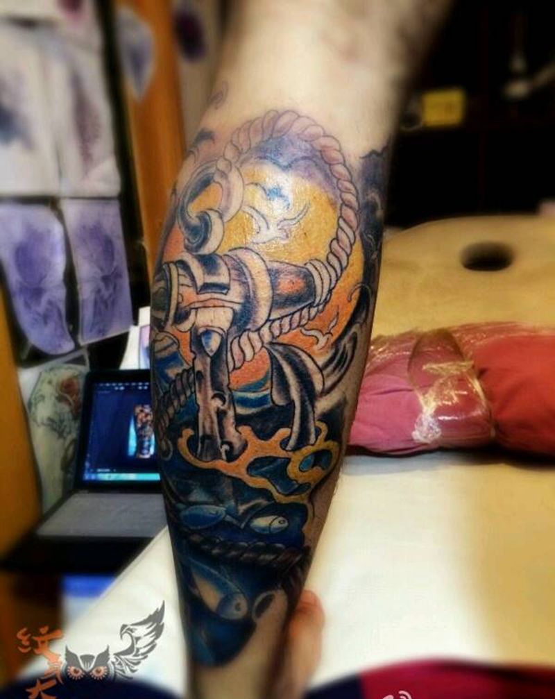 当前位置: 首页 >山东省青岛市纹身店-青岛地狱男爵刺青纹身图案>原创老外海员小腿锚纹身图片