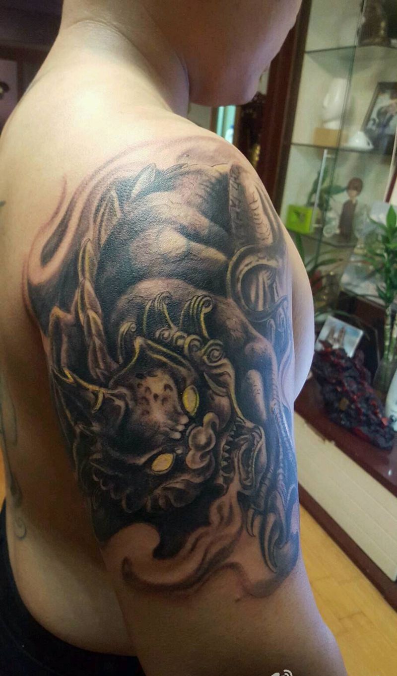 当前位置: 首页 >山东省青岛市纹身店-青岛地狱男爵刺青纹身图案>大臂“年”兽纹身图片