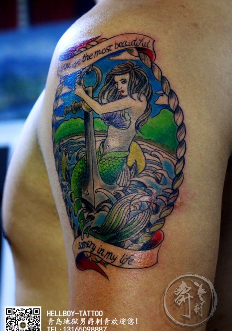 大臂美人鱼纹身图片_成品手臂欧美图腾人物鬼神青岛黄岛美人鱼锚纹身图案
