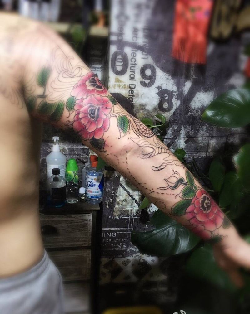 当前位置: 首页 >山东省青岛市纹身店-青岛地狱男爵刺青纹身图案>花臂纹身图片_成品手臂欧美植物青岛黄岛花臂纹身图案