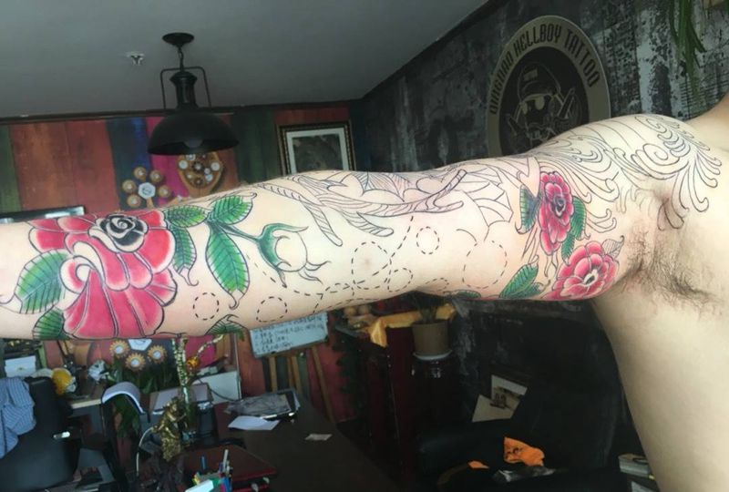 当前位置: 首页 >山东省青岛市纹身店-青岛地狱男爵刺青纹身图案>花臂纹身图片_成品手臂欧美植物青岛黄岛花臂纹身图案