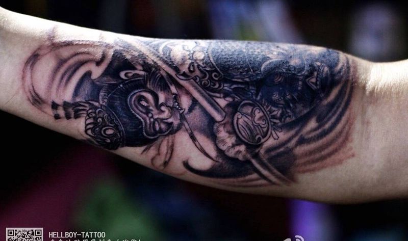 大圣遮盖图腾纹身图片_成品手臂传统鬼神遮盖纹身图案