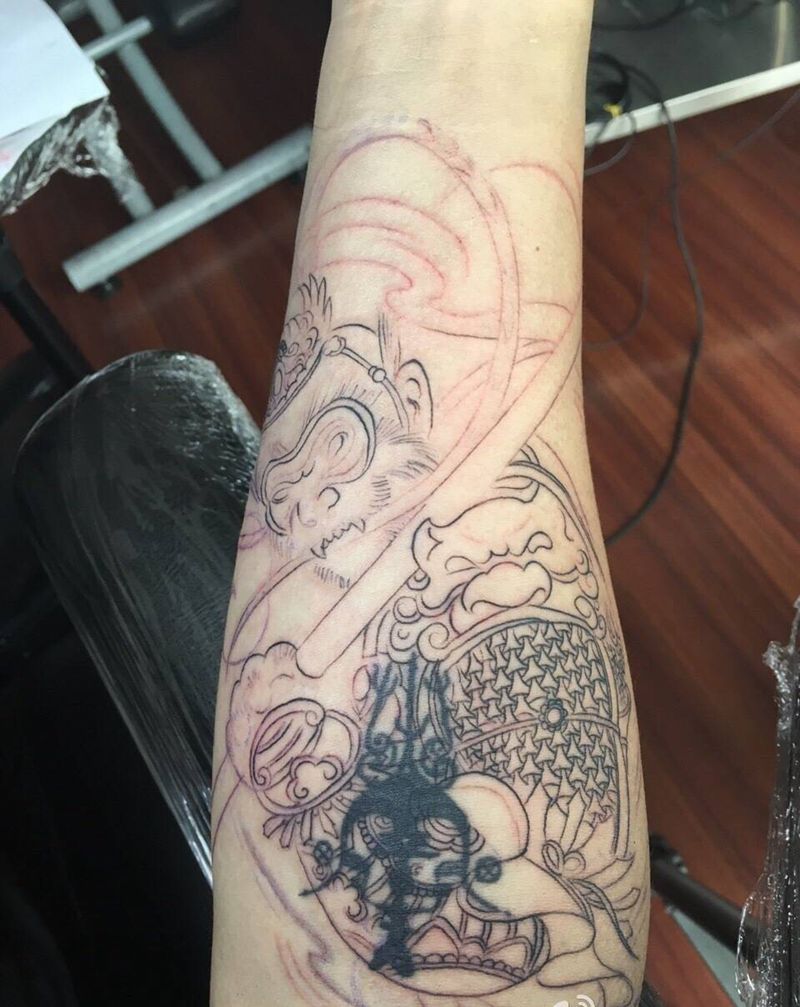 当前位置: 首页 >山东省青岛市纹身店-青岛地狱男爵刺青纹身图案>大圣遮盖图腾纹身图片_成品手臂传统鬼神遮盖纹身图案