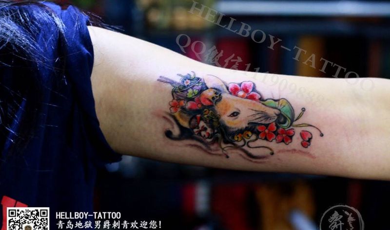 大臂内侧老鼠猴子纹身图片_成品手臂动物青岛文身黄岛老鼠猴子纹身图案