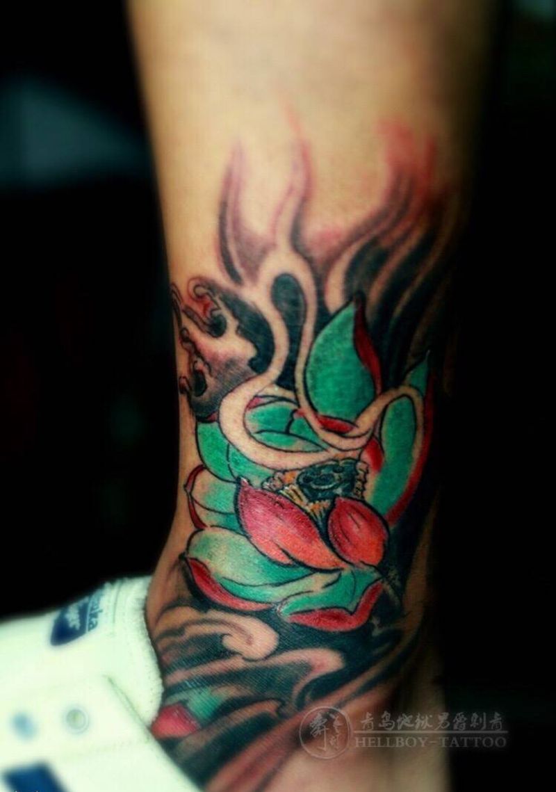 当前位置: 首页 >山东省青岛市纹身店-青岛地狱男爵刺青纹身图案>小腿彩色荷花纹身图片_成品腿部传统黄岛青岛荷花纹身图案