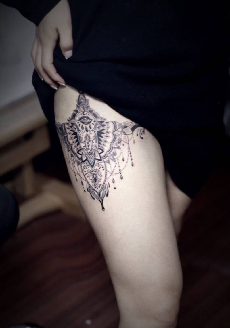 大腿法蒂玛纹身纹身图片_成品欧美腿部图腾黄岛青岛刺青青岛法蒂玛纹身图案