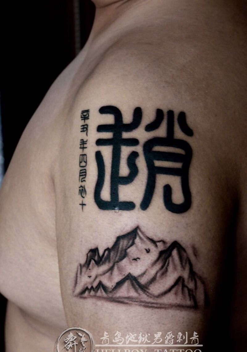大臂姓氏纹身图片_青岛刺青黄岛青岛大臂山水纹身图案