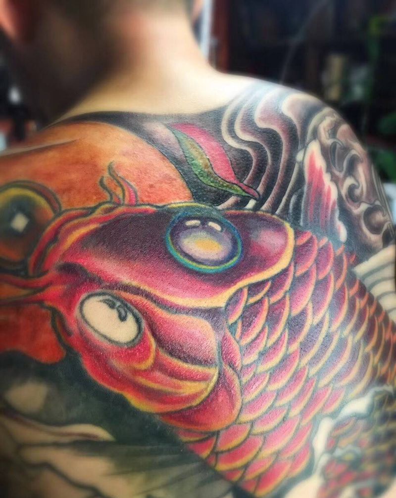 满背鲤鱼纹身图片_成品背部传统动物黄岛青岛刺青青岛鲤鱼满背鲤鱼纹身图案