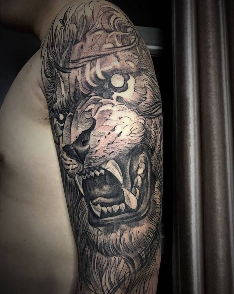 当前位置: 首页 >山东省青岛市纹身店-青岛地狱男爵刺青纹身图案>狮子神鹿花臂纹身图片_成品手臂欧美动物黄岛青岛刺青青岛狮子花臂纹身图案