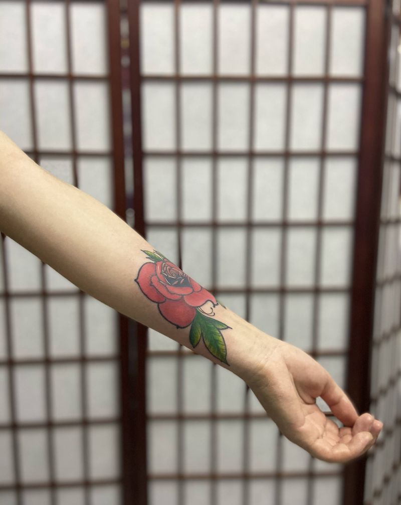 当前位置: 首页 >山东省青岛市纹身店-八玖刺青纹身图案>黑灰玫瑰花做彩色纹身图片_手臂纹身图案