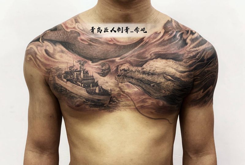 花胸 龙纹身图片_胸部新传统欧美写实龙军舰纹身图案