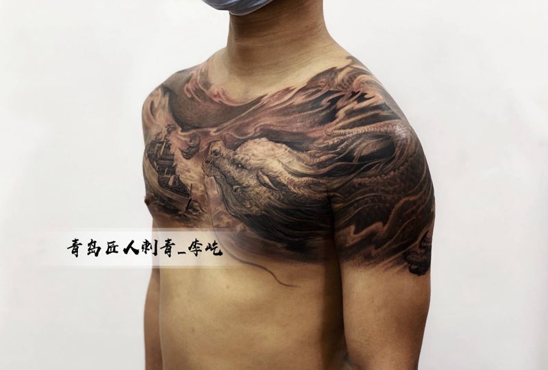 当前位置: 首页 >山东省青岛市纹身店-匠人刺青纹身图案>花胸 龙纹身图片_胸部新传统欧美写实龙军舰纹身图案