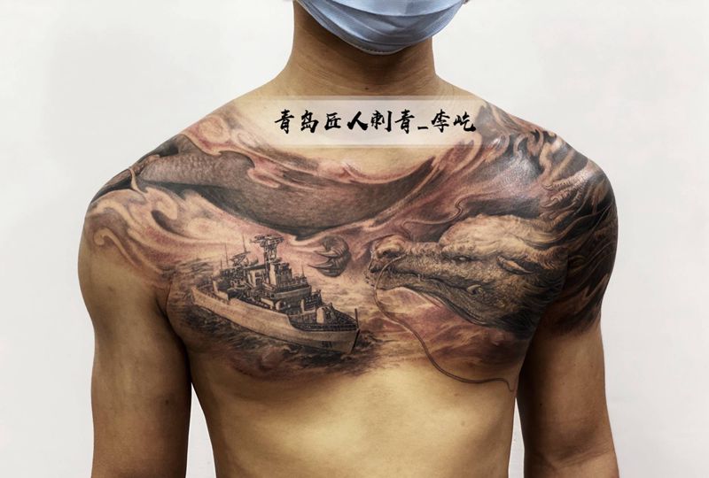 花胸 龙纹身图片_胸部新传统欧美写实龙军舰纹身图案