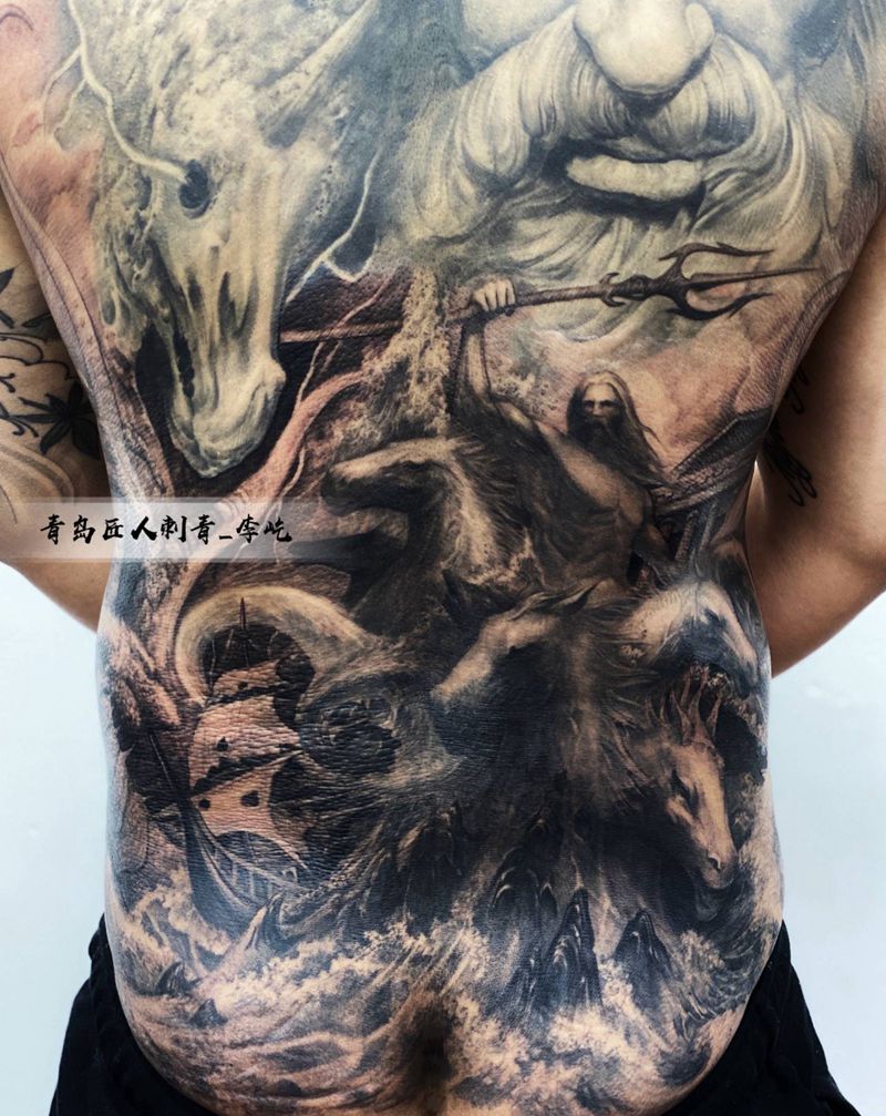 海神纹身图片_背部欧美写实新传统海神波塞冬纹身图案
