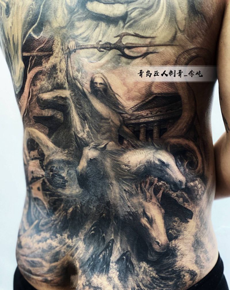 当前位置: 首页 >山东省青岛市纹身店-匠人刺青纹身图案>海神纹身图片_背部欧美写实新传统海神波塞冬纹身图案