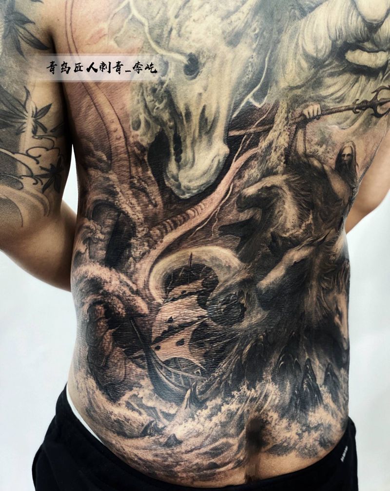 当前位置: 首页 >山东省青岛市纹身店-匠人刺青纹身图案>海神纹身图片_背部欧美写实新传统海神波塞冬纹身图案