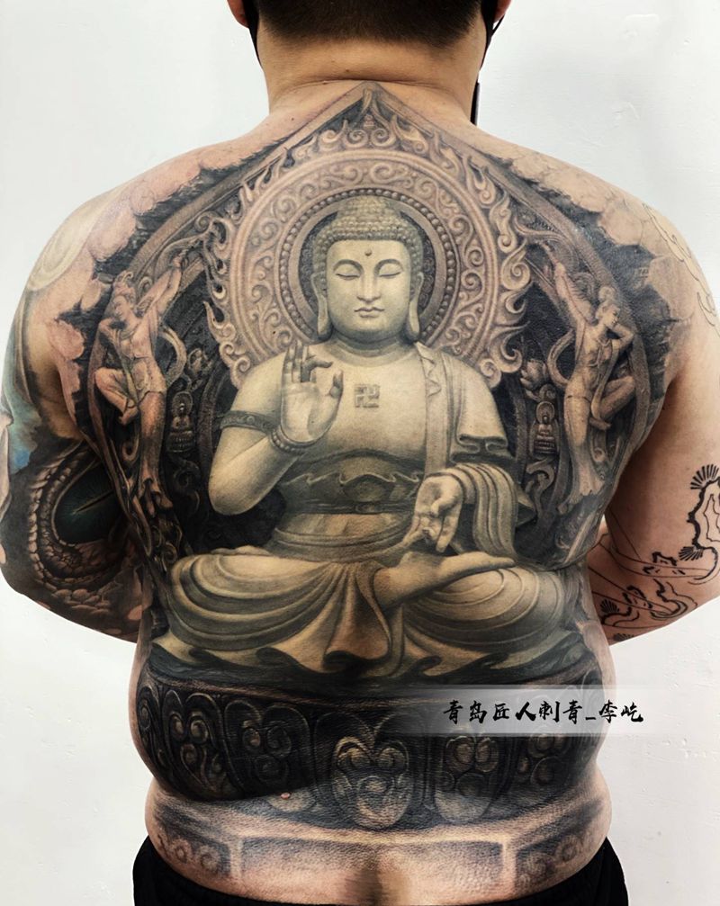 石窟 阿弥陀佛纹身图片_背部新传统欧美写实佛石雕纹身图案