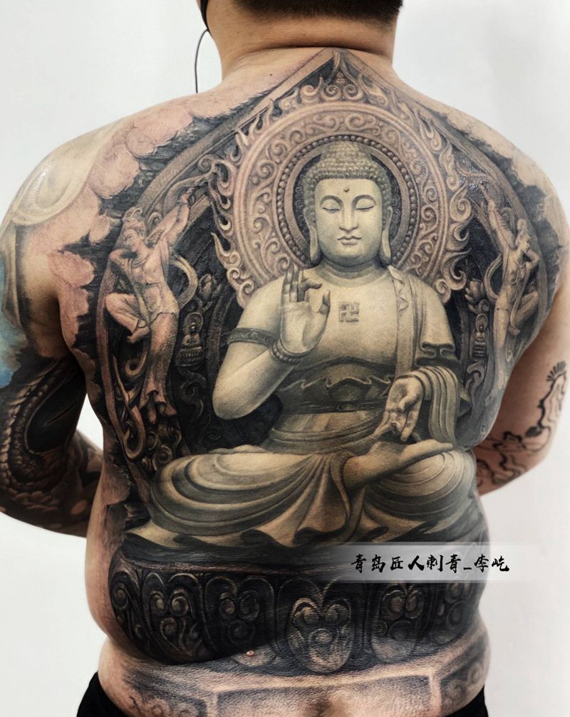 石窟 阿弥陀佛纹身图片_背部新传统欧美写实佛石雕纹身图案