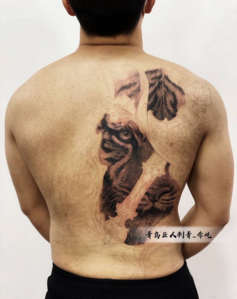 当前位置: 首页 >山东省青岛市纹身店-匠人刺青纹身图案>半背 虎 未完成纹身图片_背部新传统欧美写实虎纹身图案