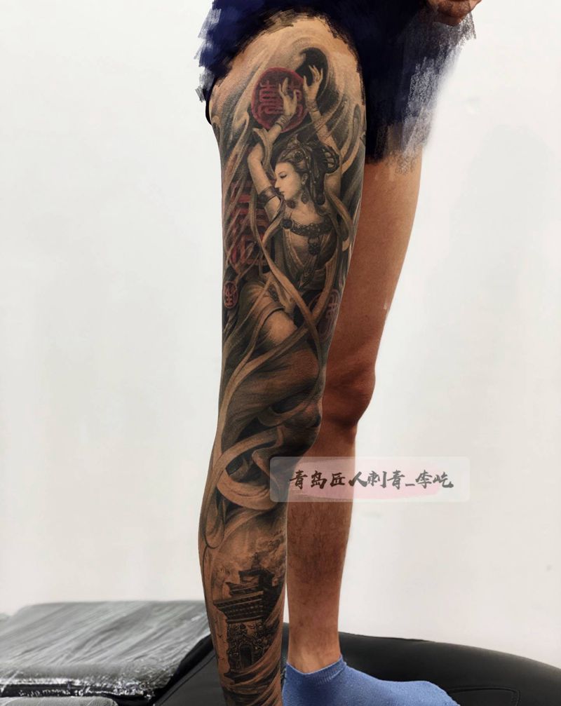 八部天龙纹身图片_腿部新传统欧美写实八部天龙飞天修罗纹身图案